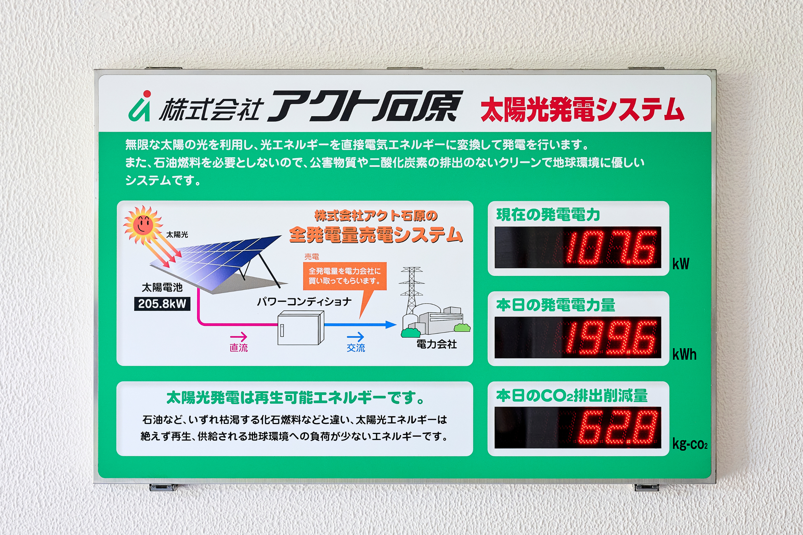 株式会社アクト石原は、地球環境の保全が人類共通の最重要課題の一つであることを認識し、全組織を挙げて環境負荷の低減及び環境保護に努力します。